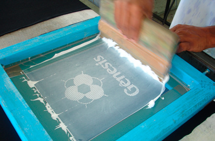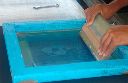 Aplicar o Plastisol Gel Branco na tela de fundo da estampa. Repicar 2 vezes ou até obter um relevo alto, realizado pré-cura entre as aplicações.