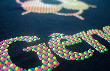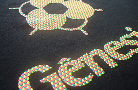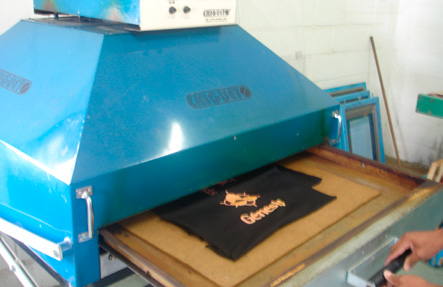 Utiliza-se 4 telas de 32 fios/cm² monofilamento, sendo a tela da base com leve relevo. As tintas utilizadas são o Plastisol Gel Branco, Pink Flúor, Amarelo Flúor e Azul Flúor.