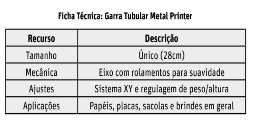 Em um mercado que exige rapidez e alta qualidade, a experiência de três décadas da Metal Printer serve como garantia de durabilidade. A Garra Tubular, com seu tamanho padrão de 28cm, foi desenhada para ser o braço direito do empreendedor, permitindo que ele atenda às demandas do negócio com a eficácia que o mercado de brindes e folhinhas exige.