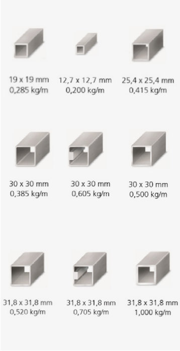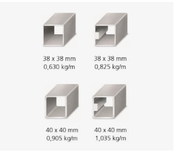 Podemos observar que, a partir de uma certa medida, chegamos a ter dois tipos de perfil com as mesmas dimensões, porém com uma diferença muito importante, que é o reforço interno, que nos permite aplicar os parafusos e chavetas diretamente no perfil, sem a necessidade de soldar uma porca ou um rebite. Desta forma, ganhamos em resistência do perfil, tanto na estabilidade do material quanto para suportar maiores tensões.